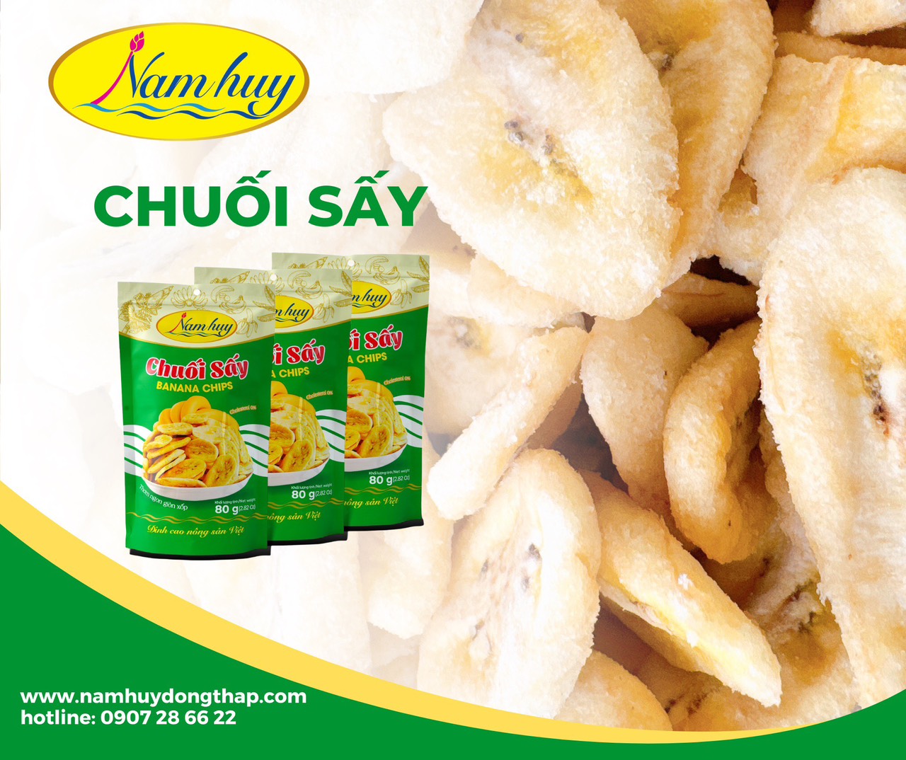 091 123 3534Chuối Sấy Nam Huy làm từ trái chuối tươi ngon. Hương vị tự nhiên, giòn, ngon, hấp dẫn, tác dụng tuyệt vời cho sức khỏe với rất nhiều dinh dưỡng và cũng rất tiện lợi khi sử dụng.